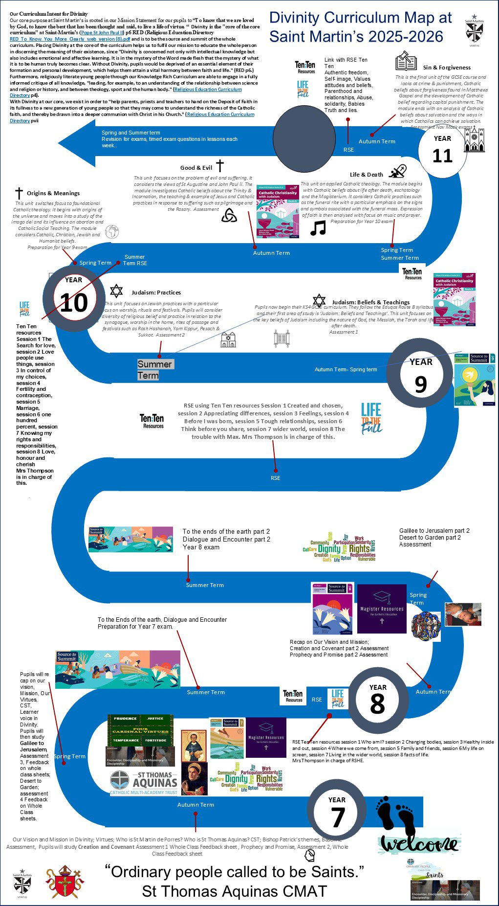 We hope that the Impact of excellent Divinity at Saint Martin’s is religiously literate and engaged young people who have the knowledge, understanding and skills – appropriate to their age and capacity – to reflect spiritually, and think ethically and theologically, and who are aware of the demands of religious commitment in everyday life (Religious Education Curriculum Directory p6). We want our young people to make a positive difference to our world through living out their Knowledge Rich Faith with Christ at the centre, through the virtues of Prudence, Fortitude, Justice and Temperance and the principles of Catholic Social Teaching. As “ordinary people called to be Saints” (St Thomas Aquinas CMAT) we do the little things in our everyday lives with extraordinary love following Bishop Patrick’s themes of Encounter, Discipleship and to be Missionary Disciples. Following the example of St Martin de Porres in the Year of Prayer leading to the Jubilee of 2025, we want our young people to be beacons of light, to treat all they met with dignity and respect as made in the image and likeness of God; to stand in solidarity with those who suffer, to show a preferential love for the poor following Pope Francis’ words, “ The poor enable us to see the face of the Father”, to “listen to the cries of the poor and the cries of the earth” (Laudato Si) through stewardship so that they can enable others and themselves to live life to the full (Jn 10:10) in a world of justice and common good for others.